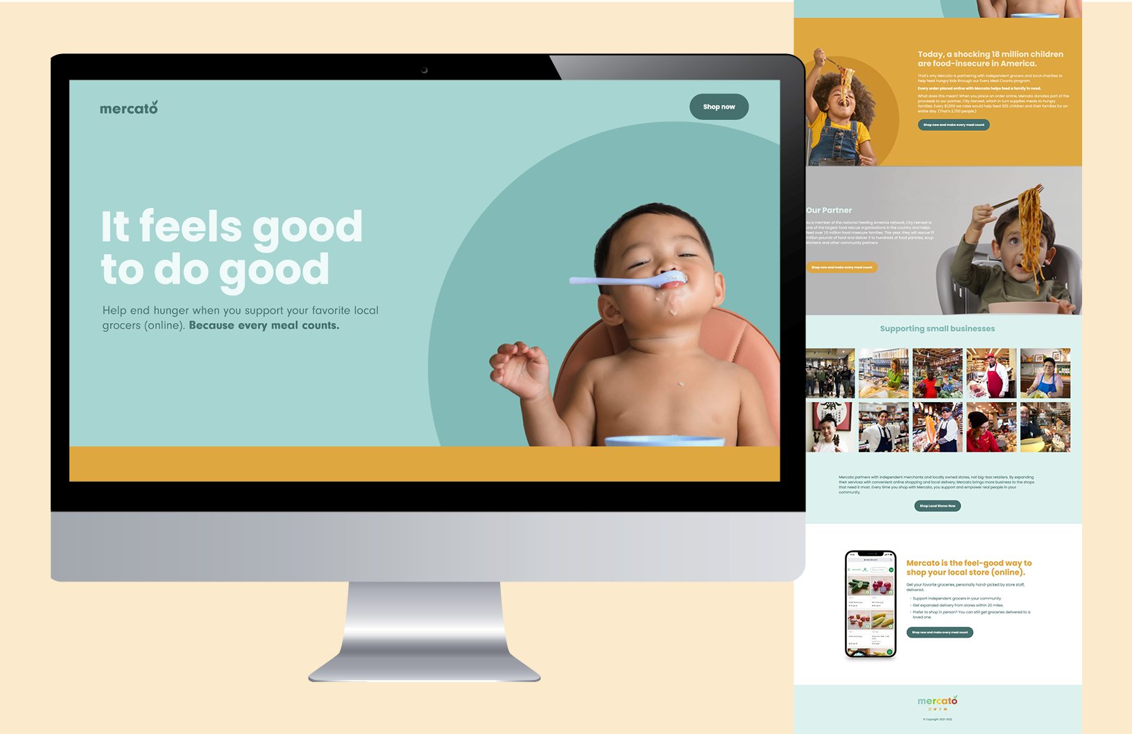 The Every Meal Counts campaign started as a seasonal campaign for the holidays in which Mercato partnered with local grocers to promote feeding hungry families with every order placed through Mercato. Both consumer and business-facing promotional designs were created including brochures, emails, an EMC-specific website that would explain more about the program. Studio photography and video content was incorporated as well.